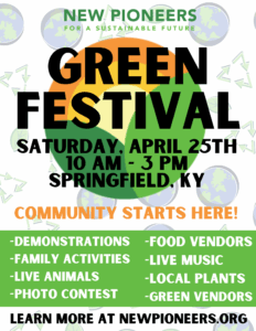 Mark your calendars for Saturday, April 25th, from 10 am - 3 pm on Cross Main Street in downtown Springfield, KY, for New Pioneers' annual Green Festival! This year marks the 17th anniversary of celebrating sustainability at our one-of-a-kind festival through live music, activities, demonstrations, AND more.